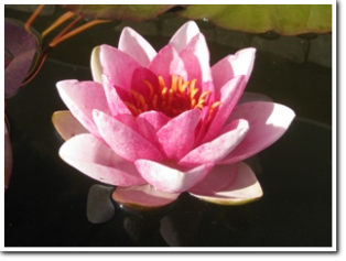 Pink. Dark pink flowers have white flecking in petals. Prolific bloomer. Leaves are blotched.