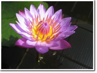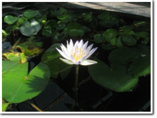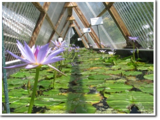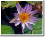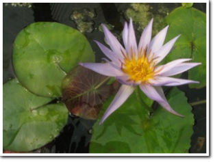 Blue. Dauben. Tiny 2" light blue flowers are held high above water surface. Faint sweet & spicy fragrance. Leaves are green with some brown splashes. Viviparous.